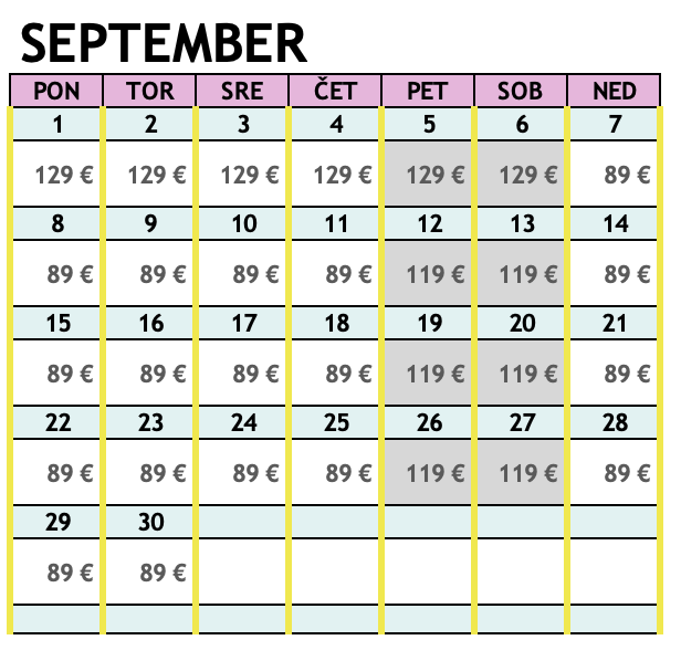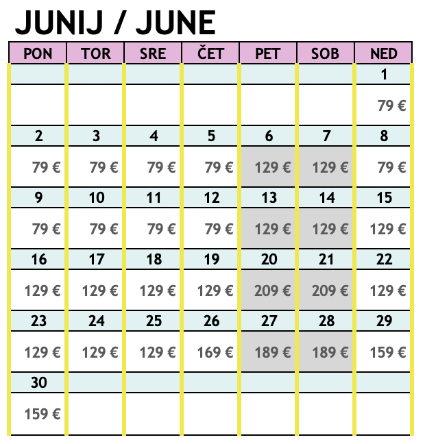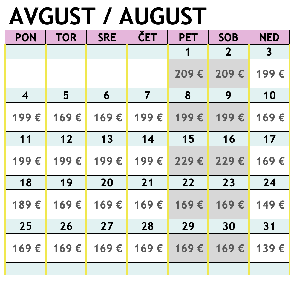 - 396 € = 4 nočitve med tednom (ned-pet)