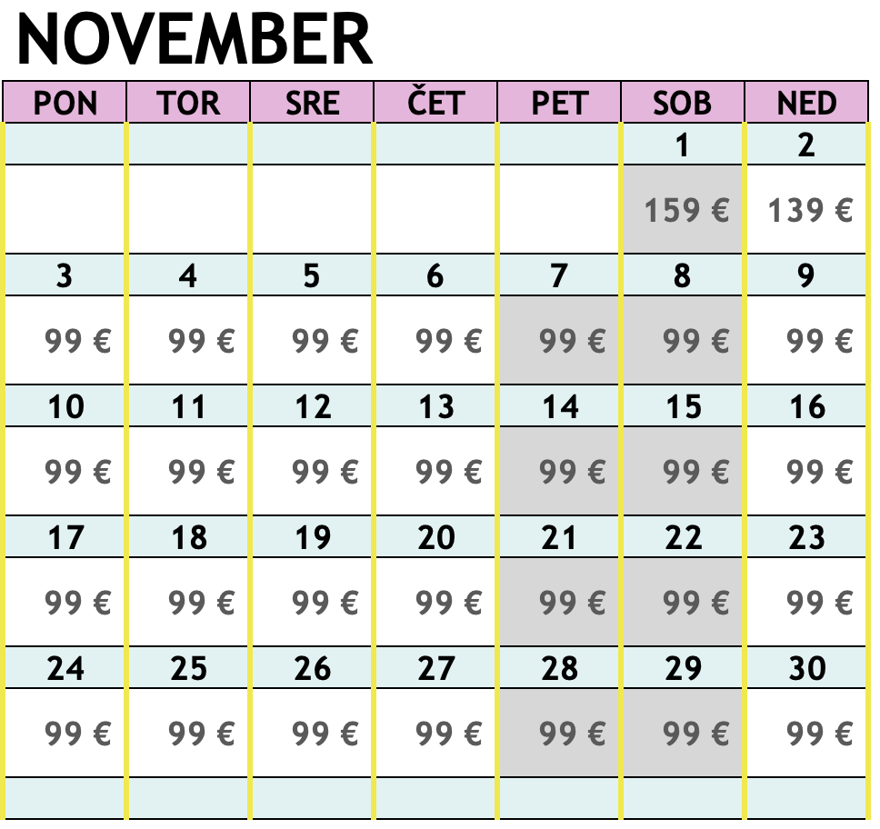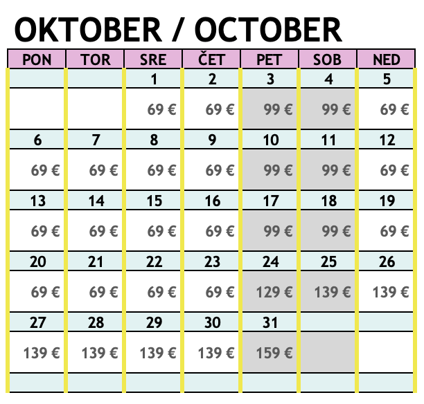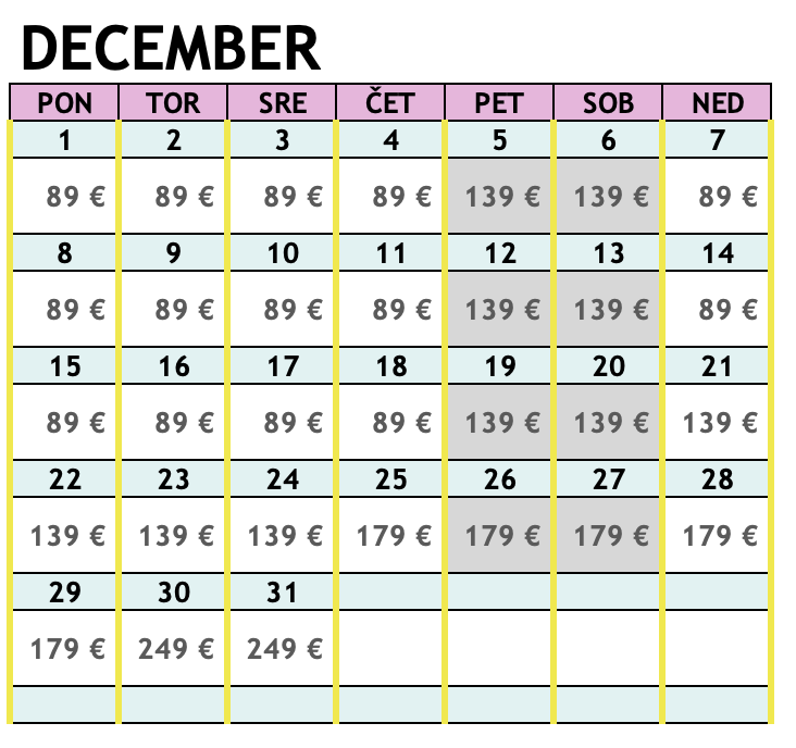- Cijena u kalendaru vrijedi za dnevni najam kućice sa kartama za kupanje (do 4 osobe)