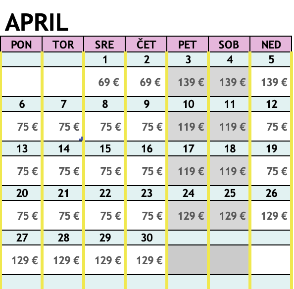 - Cijena u kalendaru vrijedi za dnevni najam kućice sa kartama za kupanje (do 4 osobe)